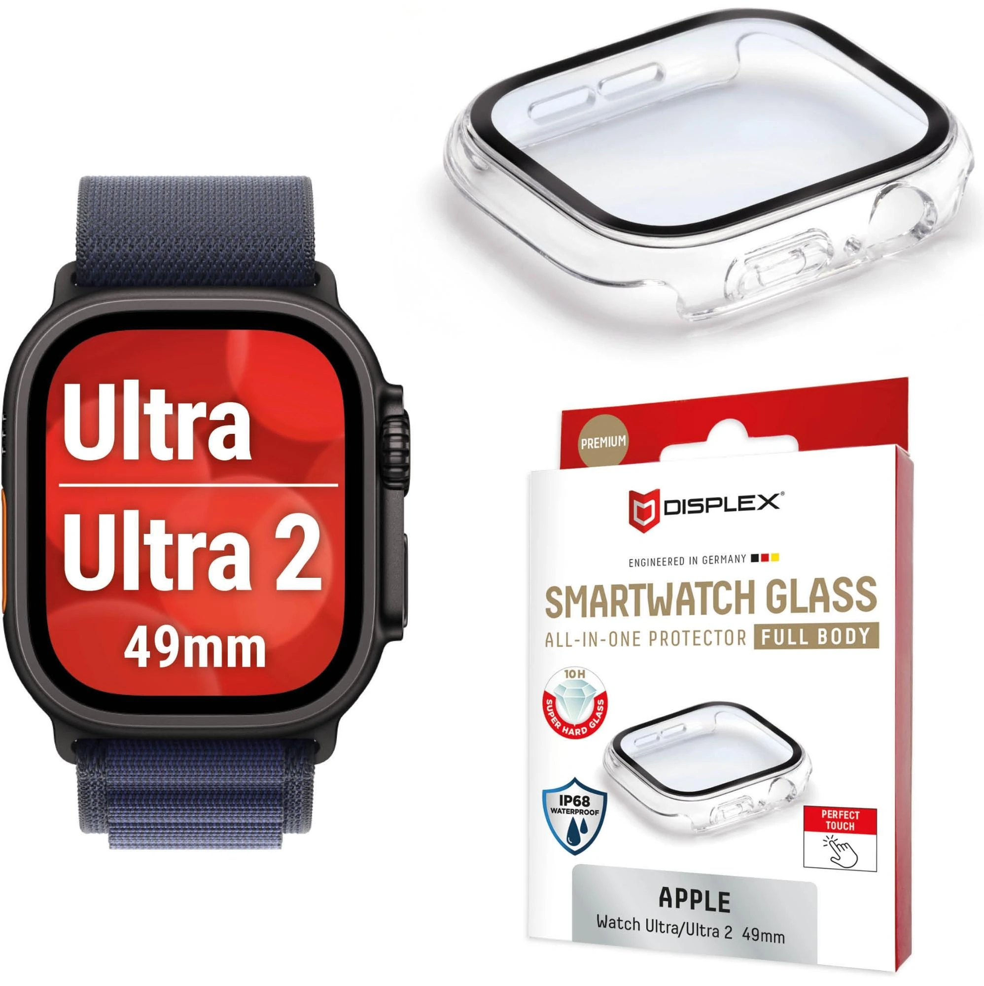 DISPLEX Premium SMARTWATCH GLASS (FULL BODY ALL-IN-ONE PROTECTOR) Hochwertiger Rundumschutz für Ihre Apple Watch Sichern Sie Ihre Apple Watch mit einer der härtesten verfügbaren Schutzlösungen: Das DISPLEX Premium SMARTWATCH GLASS besteht aus echtem, extrem widerstandsfähigem 10H-Echtglas – härter als herkömmliche Displayschutzfolien – und bietet zuverlässigen Schutz vor Kratzern, Stößen und Displaybruch.